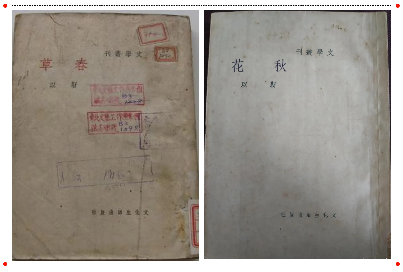 靳以的小說《秋花》和《春草》,是一對姊妹花?!肚锘ā妨腥氚徒鹬骶幍摹拔膶W叢刊”第二集,《春草》列入第八集,分別于1936年8月和1946年4月,由文化生活出版社初版。這是兩部連續性的中篇小說,《春草》是《秋花》的續集,小說中的人物是一致的,表達的主題也是一樣的。
