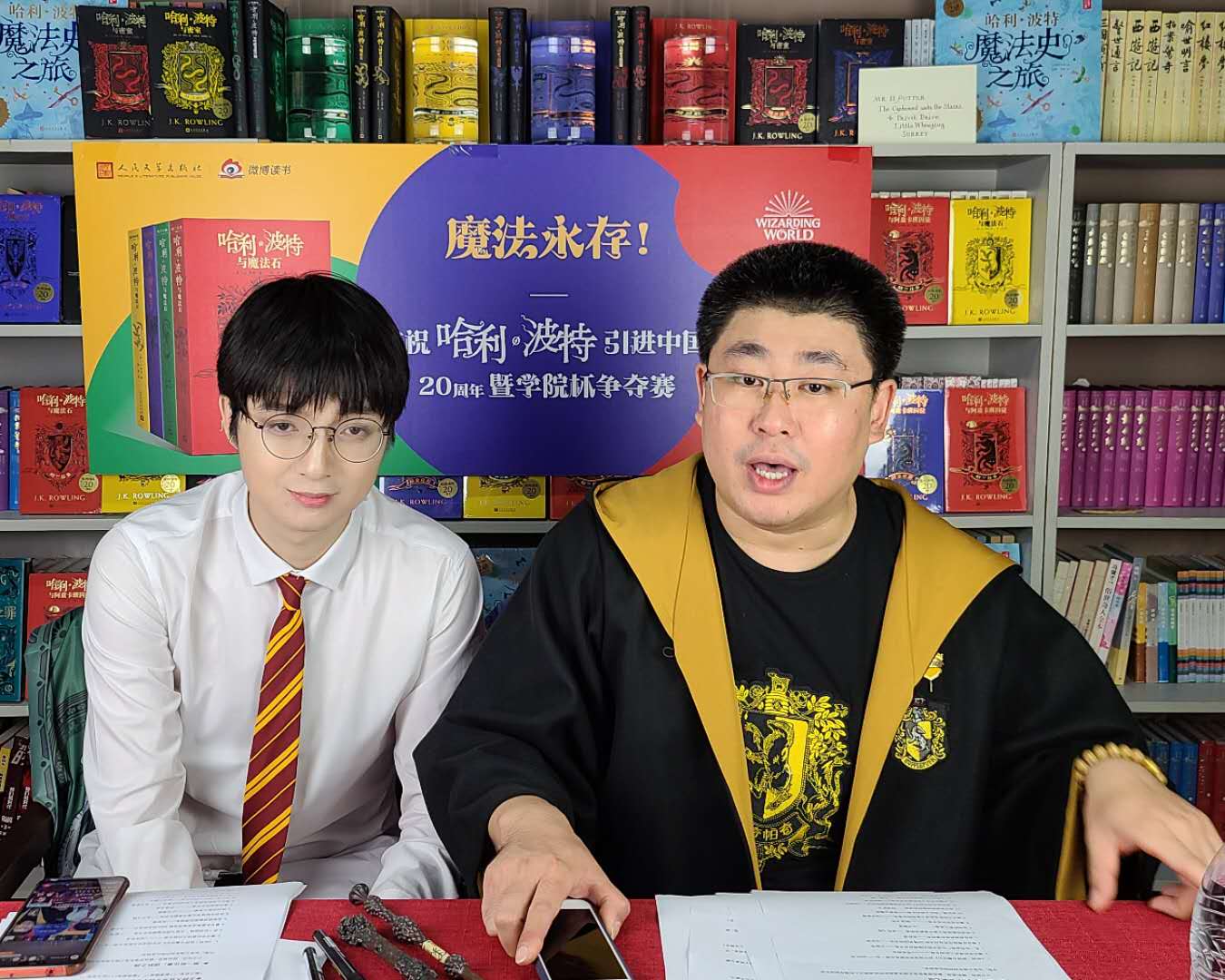 7月31日,即哈利?波特與該系列小說作者J.K.羅琳生日當天,由人民文學出版社聯合網易舉辦的“魔法永存——慶?!?波特’引進中國20周年暨學院杯爭奪賽”活動通過微博平臺舉行,在線觀看“哈迷”超過90萬。中國出版傳媒股份有限公司董事、總經理李巖和人民文學出版社社長臧永清分別致辭,“哈利?波特”系列圖書的責任編輯王瑞琴、馬博和譯者馬愛農與數十萬“哈迷”親密互動,分享20年間讀書感悟?;顒佑汕嗄暝u書演員郭鶴鳴主持。