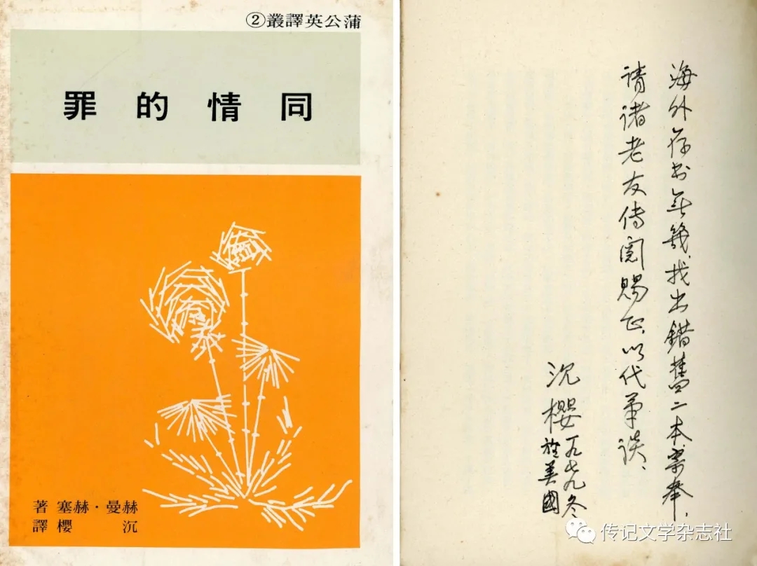 沉櫻贈送給巴金的譯作《同情的罪》并在扉頁上題詞