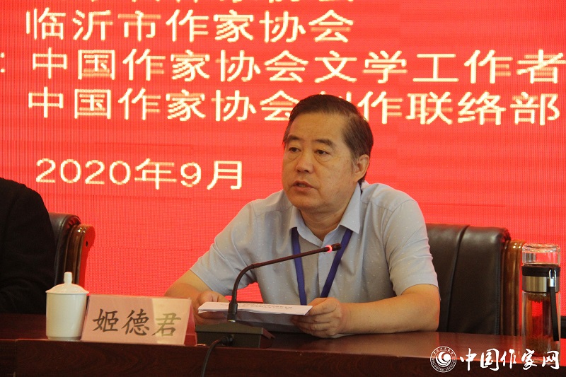 姬德君在致辭中回顧了山東的文化歷史傳統以及山東文學在中國文學發展進程中的重要作用。姬徳君表示,今年是山東文學事業在新世紀取得新成就的關鍵之年,此次“到人民中去”職業道德教育與文學社會服務實踐活動在山東臨沂舉辦,對山東作協、山東廣大作家和文學工作者們而言是一次難得的學習交流機會。山東作協將立足山東文學實際情況,引導廣大作家和文學工作者進一步提高職業道德素養,深入開展“深入生活,扎根人民”主題實踐活動,加強文學隊伍建設,積極開展文學社會公益服務活動。同時他希望山東作家堅持以“人民為中心”的創作原則,深入生活,潛心學習,創作出一批反映時代主題又具有齊魯特色的優秀作品,為繁榮發展山東文學貢獻力量。