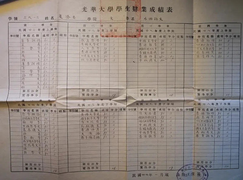 在進入私立光華大學之前,夏濟安曾先后在金陵大學、國立中央大學就讀,時間都不長,1935年因肺病休學。這張成績單中所顯示的第一學年成績并非是在光華大學的,而是夏濟安在國立中央大學哲學系的。1937年7月抗日全面爆發,處在戰爭前線的大學紛紛內遷,夏濟安一家從南京遷居上海,他隨后轉入師資條件相對較好的私立光華大學英文系,一直到1940年夏畢業。