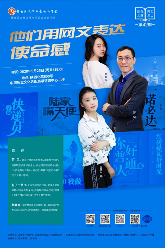 第42期陜西北路網文講壇邀請了一等獎《一諾必達》作者夢風、二等獎《你好普通人》作者包子二爺前來做客,講訴他們如何寫下了疫情中的中國故事。