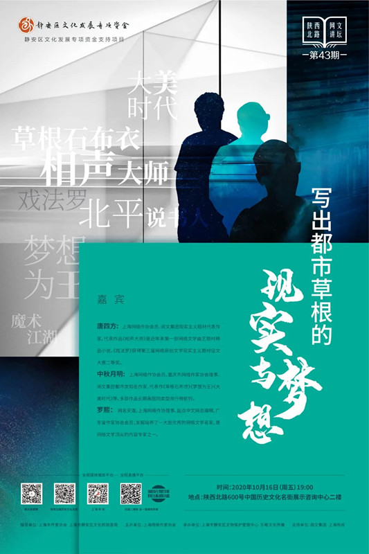 近幾年來現實主義題材網文作品影響日益強大,口碑、銷量俱佳的網絡小說改變了人們印象中網絡文學只是“言情穿越升級打怪”的文字,由于絕大多數網絡作家都是在工作之余寫作,他們筆下的現實生活反而更豐富多彩、更有質感。本期陜西北路網文講壇邀請的兩位嘉賓唐四方、中秋月明便是這類寫作的代表作家,作品《相聲大師》《戲法羅》(唐四方)、《草根石布衣》《夢想為王》《大美時代》《我只想自力更生》(中秋月明)都在平臺有很高的閱讀量,《相聲大師》《草根石布衣》入選了國家圖書館永久收藏的100部網絡小說。