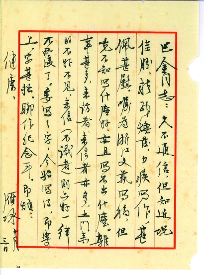 15年后,“溫暖的友情——巴金與友朋往來手札展”回到嘉興,有意無意中,展出方向竟與15年前一致,而內容涵蓋更為豐富。其中有巴金與魯迅、郭沫若、茅盾、老舍、曹禺、葉圣陶、冰心、沈從文等40余位友人及其家屬的往來手札,巴金收藏的名家書畫作品,串聯起巴金的生平創作及巴金與嘉興、嘉興人的淵源。