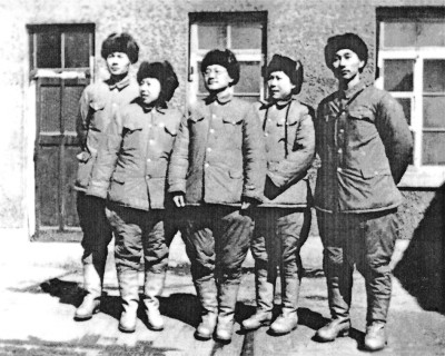 1952年3月11日部分赴朝創作組成員在沈陽東北軍區招待所門前合影。左起:李蕤、逯斐、巴金、菡子、黃谷柳。