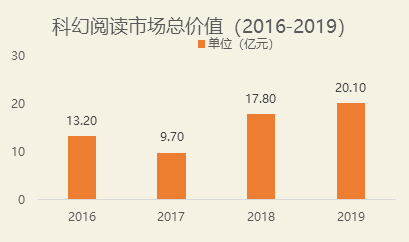 2019年科幻閱讀市場總體產值約為20.10億元,同比增長13%,市場規模較2018年有所增長,這一定程度上得益于年初《流浪地球》電影熱映的帶動。