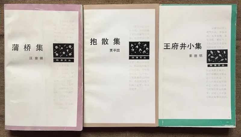 八十年代末到九十年代初,有幾套小開本值得一提:一是作家出版社的“四季文叢”,一套作家隨筆集。這套作為叢書,比較松散,扉頁、勒口或封底并沒有注明相關信息,用今天的標準來看,其實是難達標的。據我所知,應該出了四種,分別為汪曾祺的《蒲橋集》、賈平凹的《報散集》、姜德明的《王府井小集》和張承志的《綠風土》,我收了前三種。素無記書帳習慣的我,惟那個時期,買書時會在扉頁上簽名,所以知道三本分別購于和平里書亭和海淀圖書城。這套書除了選文比較精當(體現了作家社的專業標準)之外,最大特點是質樸大方,沒什么花里胡哨花的元素:封面近乎素白,書脊設計很鮮明,即使豎插在書架中,也不至于看漏。用紙雖不高級,但在那個時代也并不寒磣。