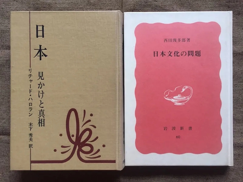 兩種類似小精裝的小三十二開日版書:《日本的外在與真相》(理查德·哈洛倫著,木下秀夫譯,時事通信社1970年4月版)與《日本文化的問題》(西田幾多郎著,巖波書店1982年3月版)