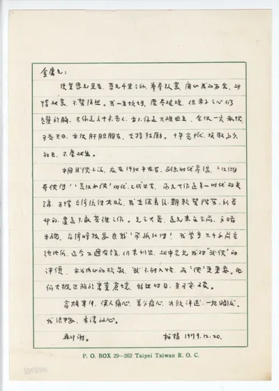 孫觀漢是著名的科學家。柏楊被判刑后,孫觀漢四處奔走,展開大力營救。在此信中柏楊、張香華向孫觀漢說明沒有寫信的原因:修改校對幾部稿子,忙得不可開交。孫觀漢來臺卻不告知日期,怕給朋友添麻煩。
