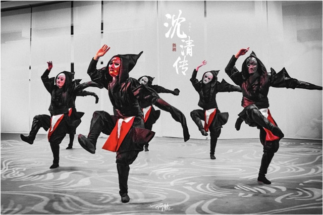 據本劇的總編導之一柯書劍介紹,在舞蹈設計編排上,巨幅折扇的運用,是作為環境移變與劇情轉折的提示點和強化點。那么,折扇不僅僅是演員手中的一個道具,更是融入到劇情當中的一個重要角色,承擔起了強化舞臺空間與劇情演變的功能。比如,當寫有“祭” 字的折扇出現時,提示進入沈清要在祭祀儀式中被投入海中的重要情節,瞬間調動觀眾情緒,扣人心弦。