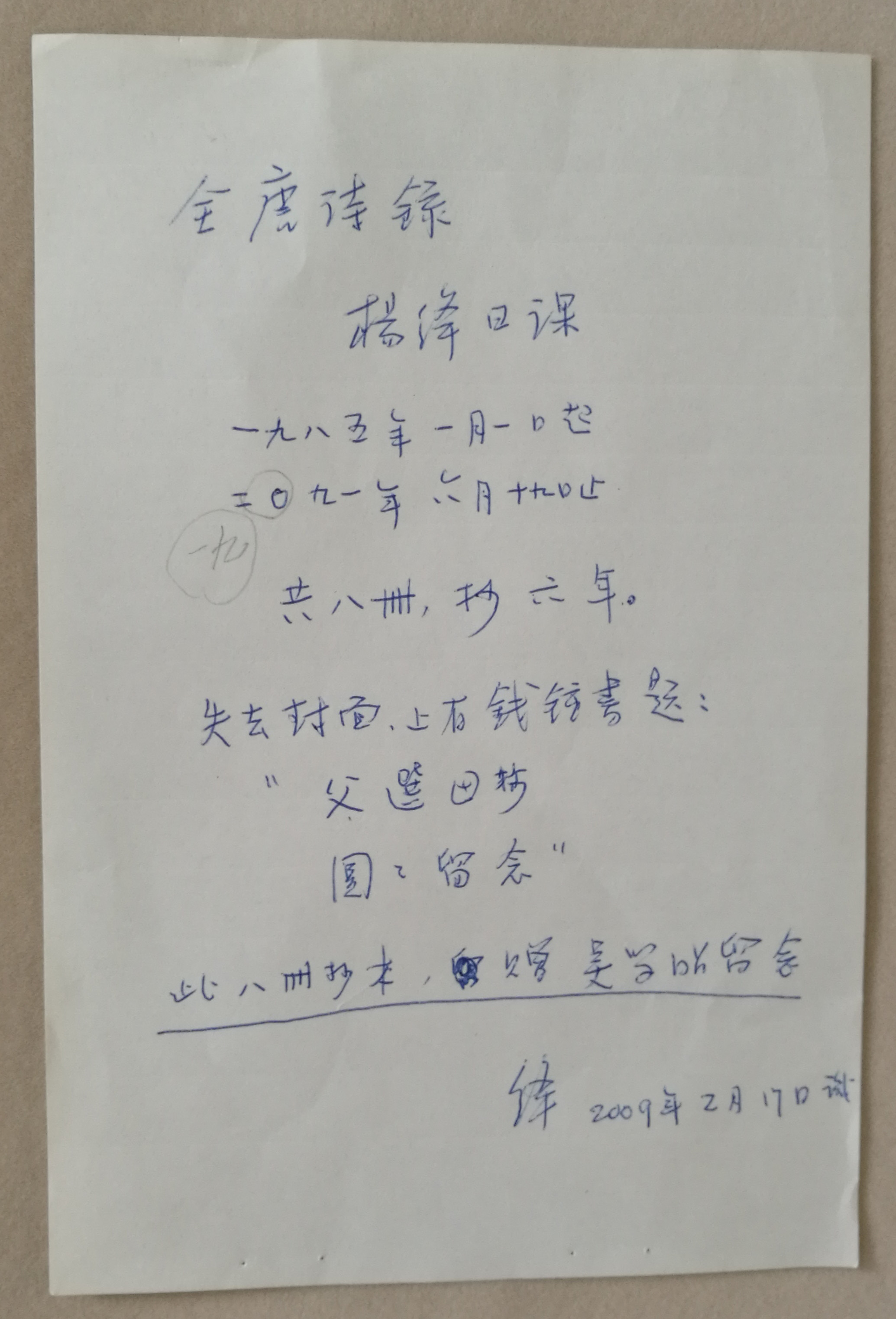 楊絳先生手書字條(字條下方書“此八冊抄本,贈吳學昭留念”。原稿實為九冊。)