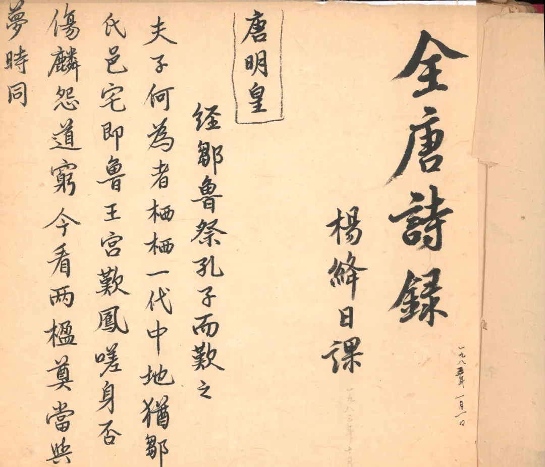 《全唐詩錄》稿本第一冊首頁。錢先生選詩中也不乏有帝王詩作,包括唐玄宗、唐宣宗、武則天等人作品,但其選詩也重在表現作者真誠的情緒,如圖中這首《經鄒魯祭孔子而嘆之》,表達了唐玄宗李隆基對夫子的同情與嘆惋之情。