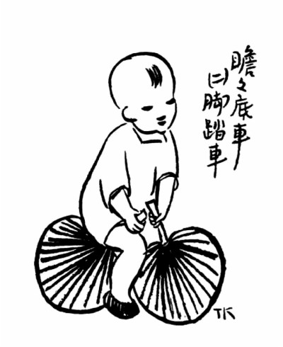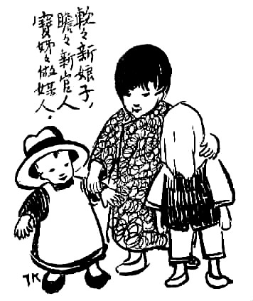 子愷先生藝術之獨特在另一方面——獨樹高標,表現童心童趣,抒情融入詼諧,展示了一種美學境界。此類經典之作大多收集于《兒童相》。令人過目不忘者如畫孩子持兩蒲扇,一前一后,作騎馬狀,題曰“瞻瞻的腳踏車”;孩子將自己的鞋子墊于四腳圓凳之下,題曰“阿寶兩只腳,凳子四只腳”。于兒童經驗之局限寫其心靈之天真,于不起眼的、平常人視之無所謂的現象中發現童心之美。還有一幅令人印象深刻,三個孩子,一女稍高,立于中,左側男孩,戴英式禮帽,甚大,右側女孩,頭蒙面布,題曰“軟軟新娘子,瞻瞻新官人,寶姊姊做媒人”。其事極不現實而孩子極慎重,于兒童顯示童心童趣,于畫則表現了先生的愛心和幽默。