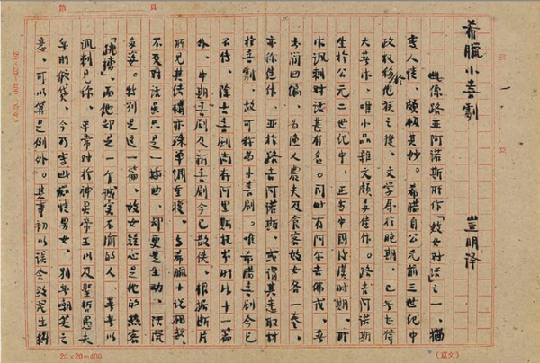 周作人早年留學日本,通曉日文、英文、 希臘文等多種文字,他十分看重日本文學和古希臘文學。日本文學自不必贅言,上述諸多手稿內容中可見周作人總頻頻提及日本。而周作人的希臘文學譯作也有二百萬言,大多為晚年完成的。他說:“余一生文字無足稱道,唯暮年所譯希臘對話是五十年來的心愿,識者當自知之?!边@批手稿中,如《希臘小喜劇》《愛說誑的人》《塔伊斯與格呂刻拉》都是與希臘文學歷史相關。