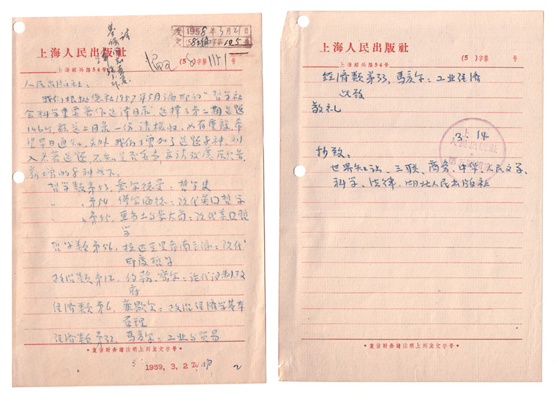 商務印書館與上海人民出版社關于《亞洲區域與經濟地理》事宜的往來登記