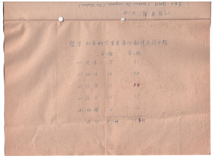 我們根據您社1957年5月編印的“哲學社會科學重要著作選譯目錄”選擇了第二期選題146個,茲送上目錄一份,請核收。如有重復,希望早日通知。另外,我們增加了選題8種,列入名著選題,不知是否妥當,亦請考慮欣告。新增的8種如下: