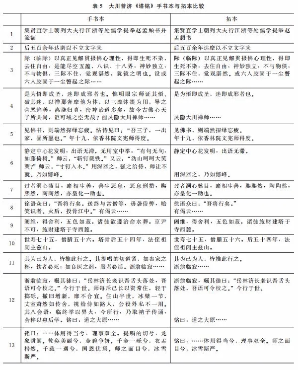 普濟塔銘的典型性在于:除了行狀之外,趙孟頫手書本塔銘及塔銘的拓本皆存世。從塔銘的制作過程可知,趙氏手書墨跡本代表了塔銘上石前的狀態,而塔銘拓本則代表塔銘上石后的狀態。依于常理,兩者應大致不差。然而兩相對比,仍有很大的差異。趙孟頫手書本《靈隱大川濟禪師塔銘》現藏上海博物館,卷子裝,寬34.4厘米,長40.9厘米。190行,每行14—15字。塔銘拓本154行,每行9—10字。兩者對比,共有13處不同,拓本比手書本少了312字之多(見表5)。