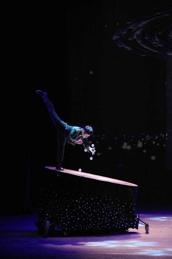 雜技主題晚會《我和我的青春—青春ing》匯聚了中雜70年享譽世界舞臺、拿遍海內外大獎的精品節目,除了根據時代主題和觀眾審美重新進行編創為一大亮點之外,由中國雜技團總工程師王建民設計的球技節目圓桌道具重裝亮相,引人關注?!队曛锌裣搿蚣肌分械膱A桌道具被打造為可以不斷“自轉”,同時圍繞舞臺“公轉”,甚至還能傾斜的移動袖珍舞臺。演員將在不斷轉動的圓桌上,隨時調整身體姿態保持平衡的同時,讓手里的多個球反彈拋接,難度之大,令人嘆為觀止。這種創新和突破也體現出中國雜技團作為國內領軍團體在推動技巧、道具等多方面雜技藝術創新路上的自信和實力。