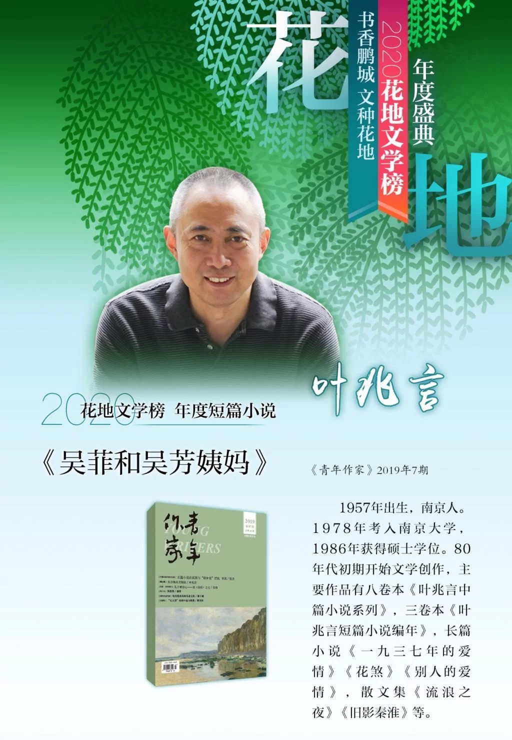 11月23日,2020花地文學榜揭曉,葉兆言《吳菲和吳芳姨媽》(《青年作家》2019年第7期)獲得“年度短篇小說”。顧廣梅為葉兆言撰寫致敬辭:“葉兆言以《吳菲和吳芳姨媽》漂亮地完成了一次有備而來的藝術搏擊,也是一次頗具挑戰性的寫作冒險,他要寫出與別人‘完全不一樣的短篇小說’。這篇小說不足萬言,卻將一對雙胞胎姐妹跌宕起伏的人生恩怨和無法抗拒的人性糾纏,寫得充滿命運感、悲劇感。淡然中蘊悲涼,疏離中透關切,短篇小說獨有的小與大、輕與重的藝術辯證法得以自如實現?!?/span>