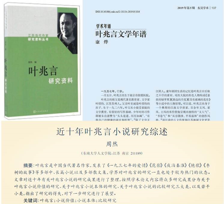 近年來,關于葉兆言的研究成果不斷豐富。左上:黃軼編《葉兆言研究資料》人民文學出版社2016年;右上:康燁《葉兆言文學年譜》;下圖:周然《近十年葉兆言小說研究綜述》。