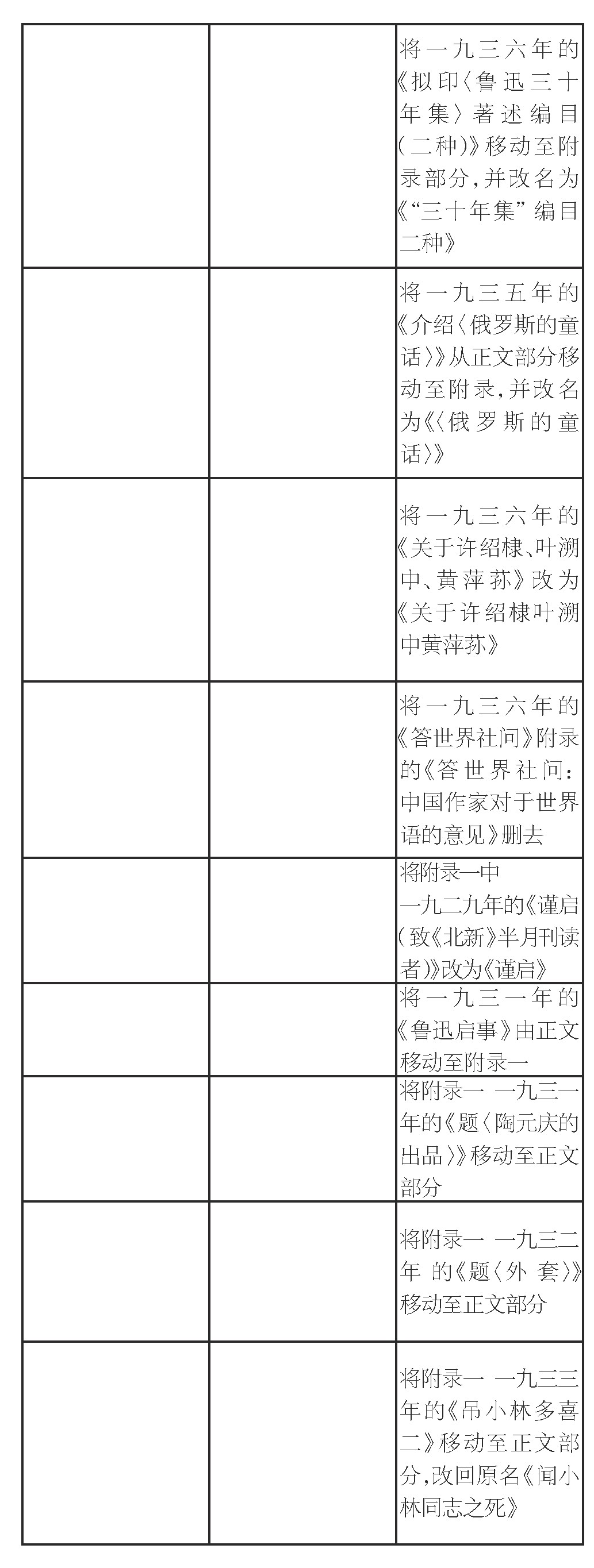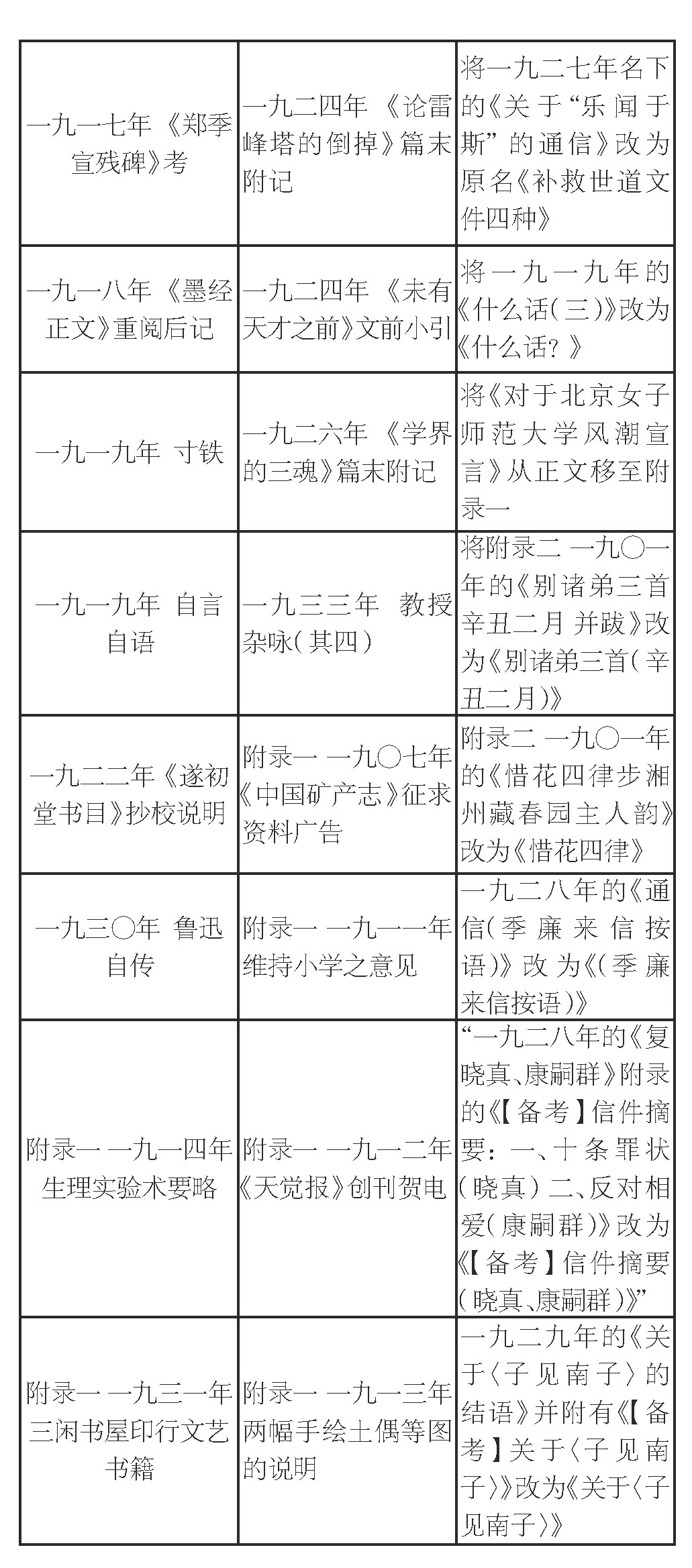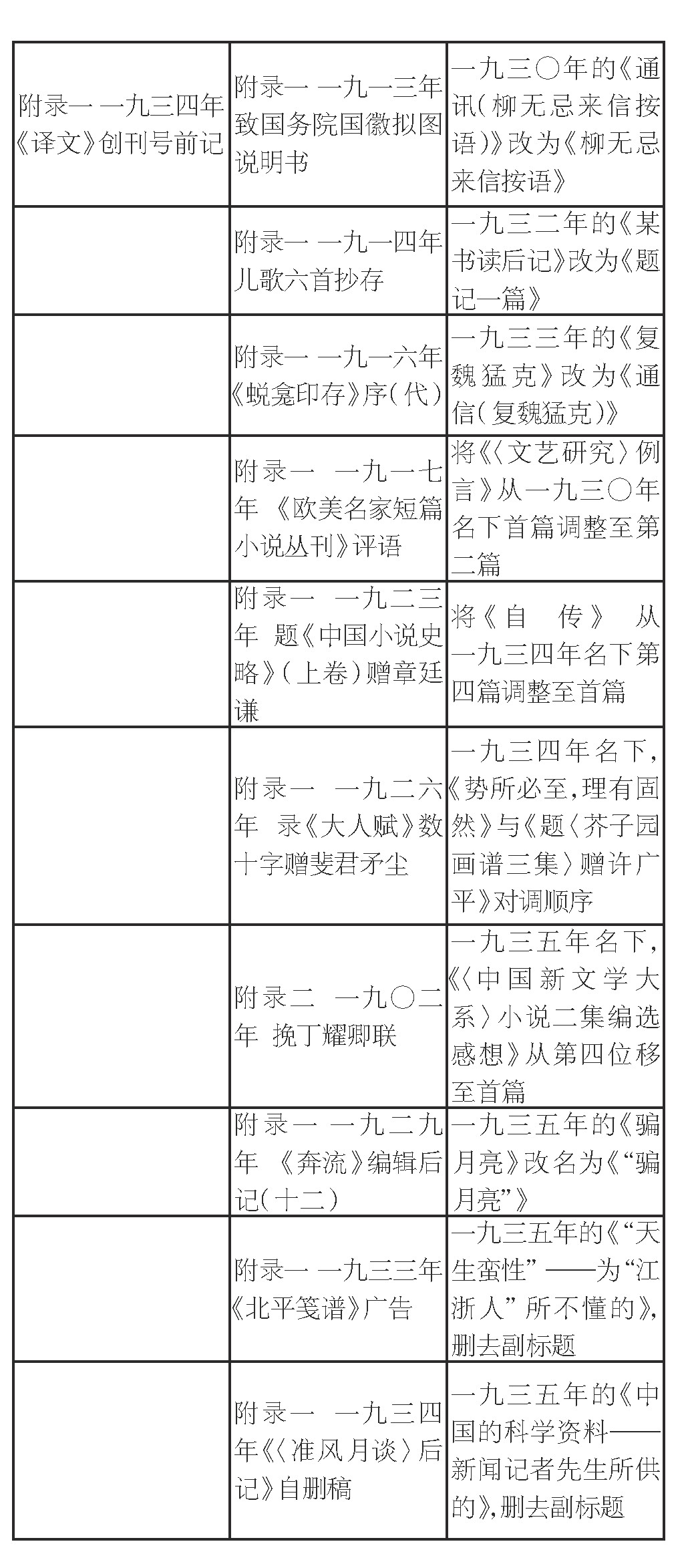 《集外集拾遺補編》篇目的變動分為三種情況——增、刪、改,數量依次遞增:增加篇目14篇,刪除篇目23篇,更改篇目42篇。更改篇目又可細分為更改標題、調整順序、調整篇目位置。更改標題25篇,如《南齊〈呂超墓志〉跋》改為《〈呂超墓志銘〉跋》,這是編注者代擬標題的情況。另一種則是恢復原有的標題。如將一九二七年的《關于“樂聞于斯”的通信》改為原名《補救世道文件四種》。調整順序6篇,根據發表時間重新排列篇目順序,如將《〈走到出版界〉的“戰略”》《新的世故》從一九二六年移到一九二七年名下。