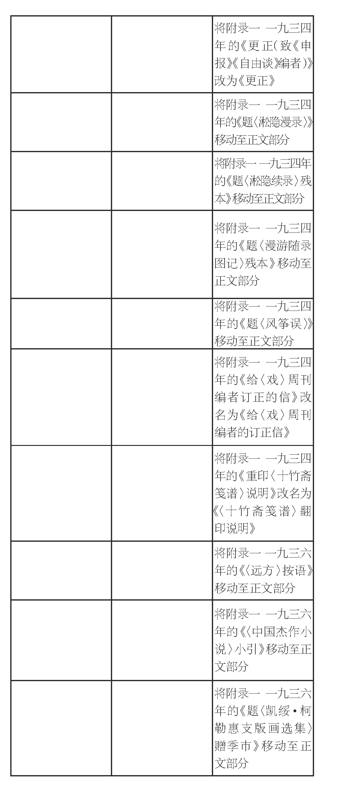 調整篇目位置14篇(其中3篇同時改名),指將文章在正文與附錄一之間對調,數量雖少,卻頗具討論空間。其中從正文轉為附錄一的4篇,從附錄一轉為正文的10篇。結合篇名與文章內容,大致可以判斷對調的原因。由正文轉為附錄一的多是應用文體,包括宣言、編目、廣告、啟事等。附錄轉為正文則更強調文學性,需要“相對成文”。10篇中有7篇都是題記,盡管短小,卻很雋永,自成一體。如《題〈陶元慶的出品〉》睹物思人,寄托哀思懷念,感情真摯強烈?!额}〈淞隱漫錄〉》等四篇介紹古籍版本源流、考訂異同,已形同書話。其他三篇,《聞小林同志之死》近似于悼念詞和聲明的復合體?!丁催h方〉按語》《〈中國杰作小說〉小引》兩篇則實際是序跋。