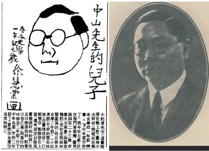 將此畫與孫科當年的照片相對比,但見徐慧棠小朋友筆觸雖稚嫩,卻寥寥幾筆,便準確地勾勒出孫科的外貌特征:圓圓的腦袋,梳成三七開的短發覆于其上,鼻上架著一副標志性的圓框眼鏡。簡直是惟妙惟肖,栩栩如生??紤]到年齡之小,更令人驚異。