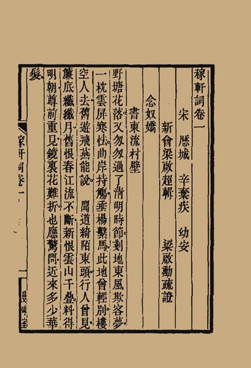 《稼軒詞疏證》一書就是在這一思想指導下,運用現代文獻學方法研究稼軒詞的結晶。梁氏兄弟對于辛棄疾的英雄事跡和《稼軒詞》的英雄氣概都極為推崇,稱得上一種“稼軒情節”。為了“提出整個之辛棄疾,以公諸世”,先是梁啟超編纂《辛稼軒先生年譜》,惜未竟而卒,隨后梁啟勛編《稼軒詞疏證》,“繼伯兄未竟之業”(《稼軒詞疏證序例》),還在卷首撰寫《稼軒先生之特殊性格》一文,“列舉客觀之事實”,“表現先生之全人格”(同前)。他以信州本為底本,參以吳訥《百名家詞》本等版本,共輯得辛詞623首,在當時已允稱賅備。全書分為六卷,以年為序,卷一、二為淳熙丁未以前詞,卷三為戊己庚辛四年詞,卷四、五為壬子至辛酉之十年間詞,卷六則為壬戌以后四卷本所未收之詞,每卷先標出年歲及所在地,每首之下先錄梁啟超??迸c考證語,次錄梁啟勛案語。雖然梁啟勛自謙不敢稱編年,但其結構體例已開創了詞集編年箋釋之法。是書在辛棄疾生平考辨上也有很多創獲,如《沁園春·帶湖新居將成》,據洪景盧《稼軒記》和辛敬甫《稼軒年譜》,證新居落成于淳熙十二年,移帥隆興府也在十二年。林志鈞認為是書“大之足以補史傳、方志所不備,次之則稼軒生平志業、遭際出處蹤跡,俱略可悉”(林志鈞《稼軒詞疏證序》)。要之,《稼軒詞疏證》是梁氏昆仲辛棄疾研究的結晶,是現代詞學文獻學的重要收獲,也是梁啟勛以意境和情感為核心的詞藝觀和批評觀的集成式成果。