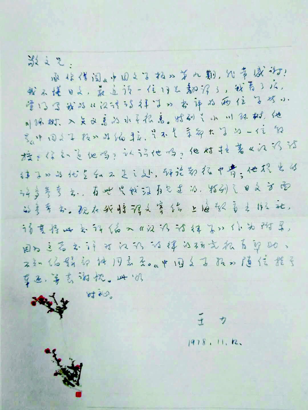 從此信內容來看,1978年,鐘敬文在得知王力準備再版《漢語詩律學》之后,向其寄送《中國文學報》第9期?!吨袊膶W報》創刊于1954年,由日本京都大學文學部中國語學中國文學研究室主編。王力的《漢語詩律學》在1958年出版后,就引起日本漢學家小川環樹、入矢義高的關注,當年即在《中國文學報》發表書評。由于多種原因,直到1978年,王力才通過鐘敬文的推薦看到這篇書評,他對文中的觀點表示支持,認為很有價值,并建議上海教育出版社把此文收入《漢語詩律學》修訂版。不過,從1978年2月王力寫好《漢語詩律學》的《重版序言》可推斷,可能當時上海教育出版社已經開始排版工作,故這一建議未實現,未加入這篇書評。