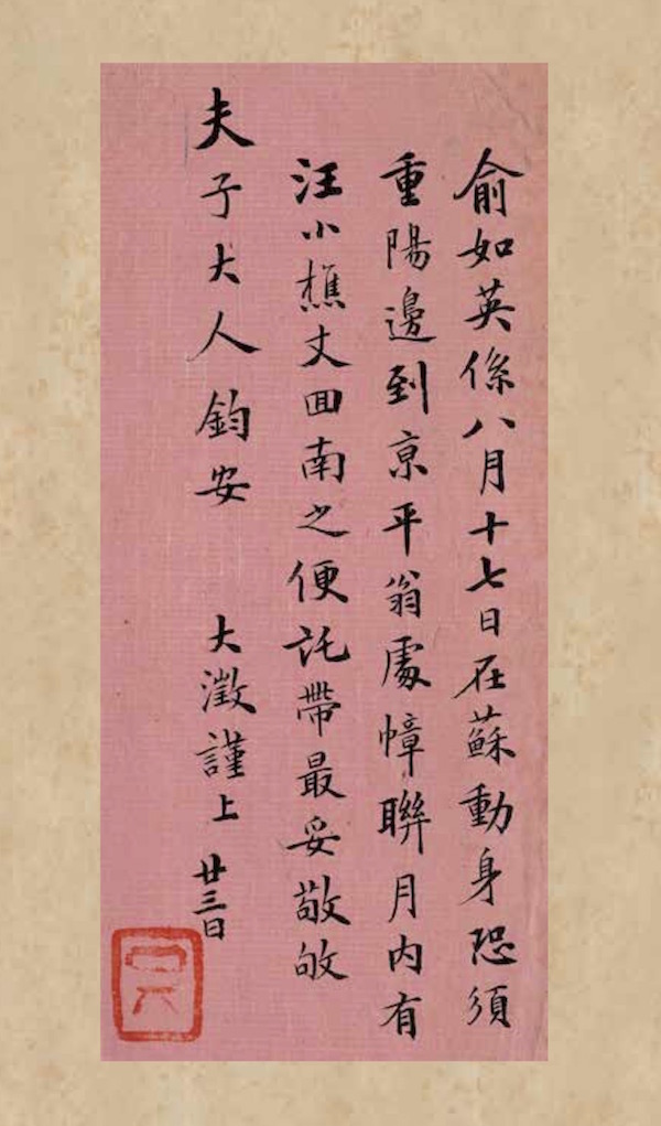 俞如英系八月十七日在蘇動身,恐須重陽邊到京。平翁處幛聯月內有汪小樵丈回南之便托帶最妥。敬敂 夫子大人鈞安。大澂謹上。廿三日。