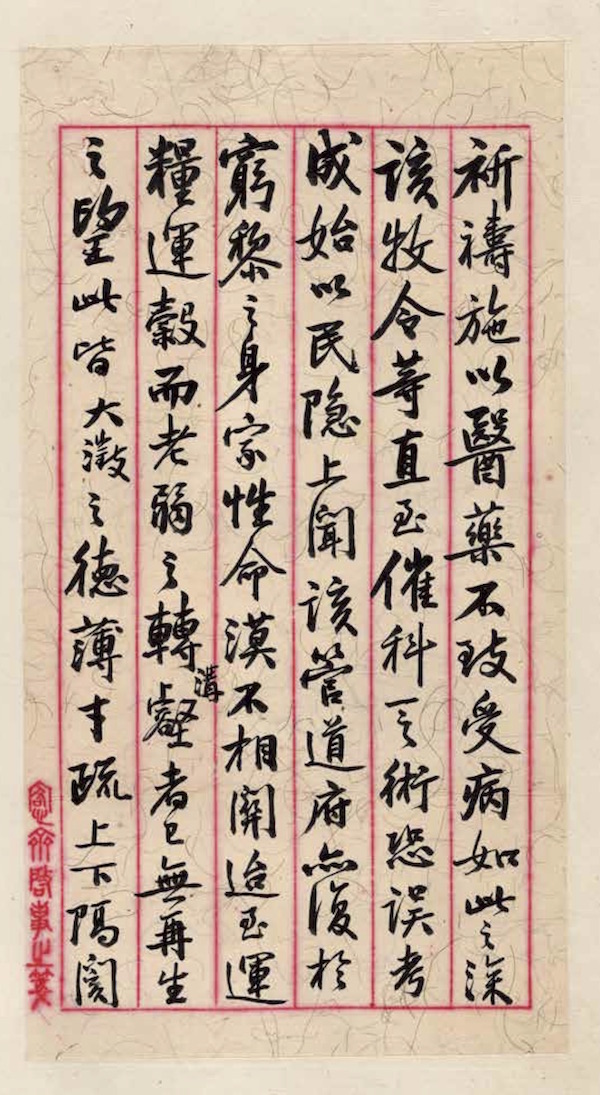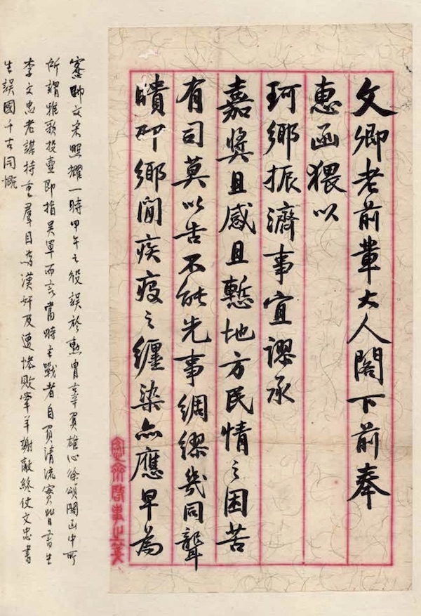 文卿老前輩大人閣下:前奉 惠函,猥以珂鄉振濟事宜,謬承 嘉獎,且感且慚。地方民情之困苦, 有司莫以告,不能先事綢繆,幾同聾瞆耶。鄉間疾疫之纏染,亦應早為