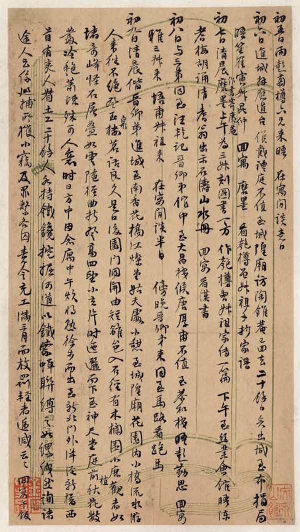 早在同治元年(1861),吳大澂就奉母命,與表弟汪鳴鑾偕赴京師,應順天恩科鄉試。他因失利流落在京,遍訪同鄉戚友,對世道冷暖深有體會,幸好世居葑門南園的彭狀元后人彭蘊章(1792—1862)伸出援手,請他到家中坐館,課讀幼子彭祖潤(岱霖)。今《乙丑日記》附有吳氏致彭祖潤等手札,頗疑此冊日記曾經彭氏保存。