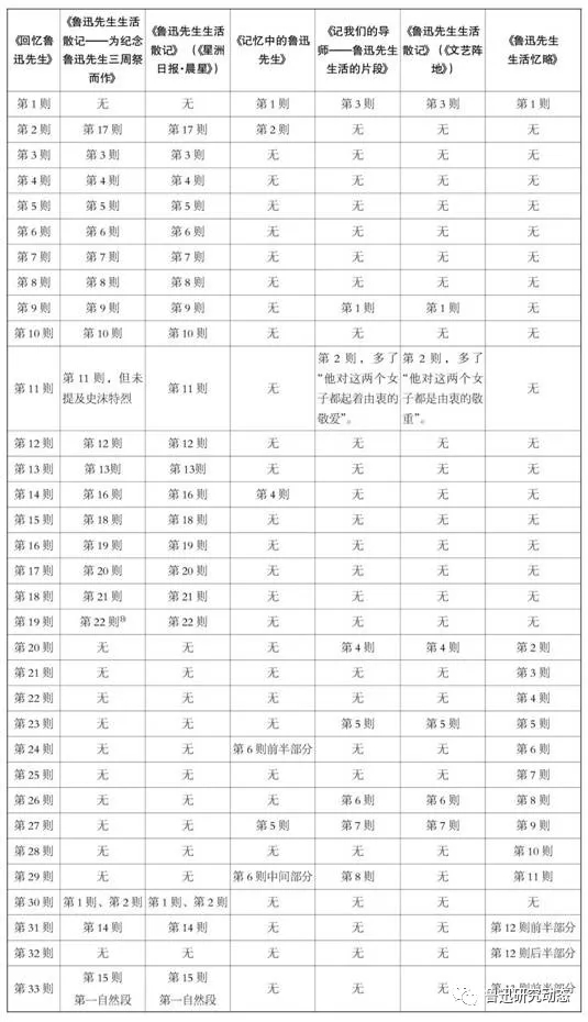 為更直觀地看出上述文章的關聯內容及關聯程度,筆者將《回憶魯迅先生》的各則內容與上述六篇文章進行了比較,整理如下: