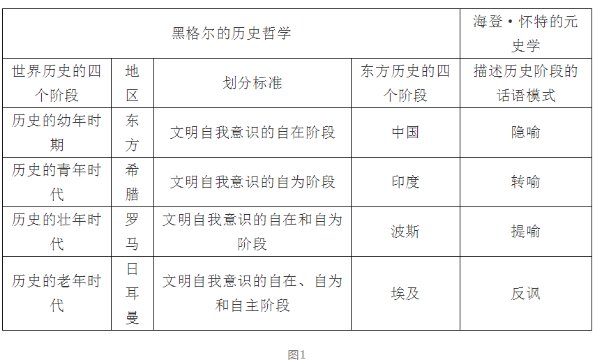在《歷史哲學》中,黑格爾將世界歷史分為四個階段。(1)“歷史的幼年時期”:東方。(2)“歷史的青年時代”:希臘。(3)“歷史的壯年時代”:羅馬國家。(4)“歷史的老年時代”:日耳曼。他還將東方歷史分為中國、印度、波斯和埃及四個階段。[24]那么,如果以海登·懷特的元史學理論來看,黑格爾劃分歷史階段的標準是什么?為什么把東方作為“歷史的幼年時期”?為何把中國作為東方歷史的第一個階段?