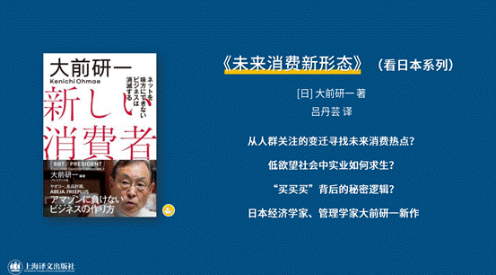 日本觀察方面,日本經濟學家、管理學家大前研一的又一日本觀察力作《未來消費新形態》將于今年與讀者見面。作為《低欲望社會》的姊妹篇,大前研一在該書中基于敏銳的社會透視,提出日本“低欲望社會”形勢下的新經濟對策。他提出了“不能善用網絡的商家將退出歷史舞臺”,分析了經濟形勢下出現的新問題:急速增長的共享經濟、偶像經濟、從物品消費向體驗消費的轉變等。