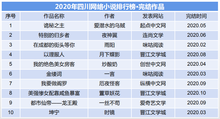 根據《2020年度四川省網絡小說排行榜評審工作方案》,經初評、終評程序,評選出2020年已完結網絡小說《詭秘之主》(愛潛水的烏賊)、未完結網絡小說《元尊》(天蠶土豆)等20部作品?,F將名單公示如下。