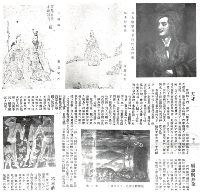 除了期刊連載外,《九歌圖》還以單幅人物畫的形式充當報刊的不同組成部分。如1941年5月5日出版的第89期香港《大風》報,封面畫即用了趙子昂《九歌圖》中的東皇太一畫像。再如孫作云的《九歌山鬼考》一文(《清華學報》1936年第11卷第4期),在第二部分“山鬼的姿容及其它”中,作者結合《山鬼》“若有人兮山之阿,被薜荔兮帶女羅,既含睇兮又宜笑,子慕予兮善窈窕。乘赤豹兮從文貍,辛夷車兮結桂旗,被石蘭兮帶杜衡,折芳馨兮遺所思”八句,以及王逸、聞一多的注解、詮釋,判定山鬼的姿容與神女相同,是很美麗的:“八句中或言體貌之容冶,或言被服之芬芳,或言車仗之盛飾,全是描寫一位佳人的?!睘榱伺浜洗苏?,作者特意在此擇選了蕭云從與陳洪綬的《山鬼圖》作對比,并作評價曰:“只有趙孟頫、陳洪綬一流的笨伯,才會將一副猙獰的魔鬼面相繪入《九歌圖》里去。蕭云從則知道涵詠《山鬼》的文詞,所以不致鬧出那樣的笑話來?!睂O作云立足于《山鬼》的文意,充分肯定了蕭云從圖文相符的創作,以對原文摹畫的真實與否來判定《山鬼圖》的優劣,并在此基礎上認為陳洪綬脫離原文的想象為“笑話”。這篇文章是民國間報刊所登載《九歌》研究中,首次將圖像引入學術論文中并作相應分析的案例,可見在當時前賢學者已有了圖像、文物與文本研究相結合的現代學術意識。