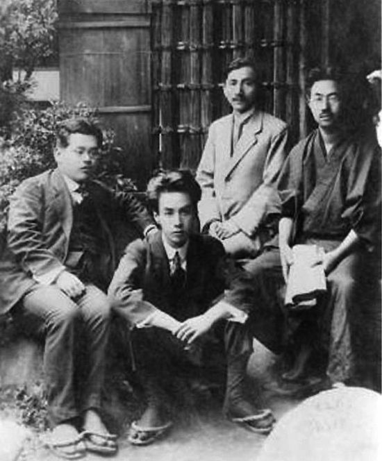 1919年,芥川龍之介與友人,中間蹲坐者為芥川龍之介,照片最左邊者為菊池寬。