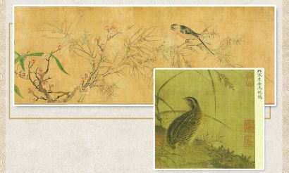 陳洪綬《春風蛺蝶圖卷》(局部)。宋畫精品《鵪鶉圖頁》。(均上海博物館供圖)制圖:李潔