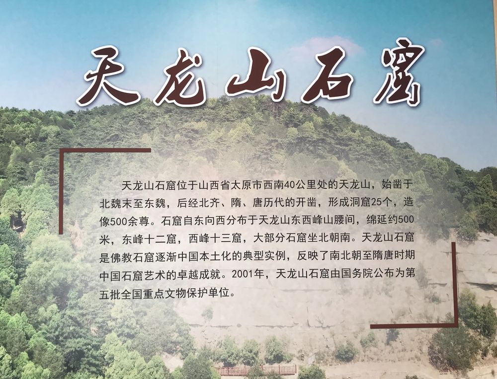 據介紹,天龍山石窟位于山西省太原市西南40公里處的天龍山,始鑿于北魏末至東魏,后經北齊、隋、唐歷代的開鑿,形成洞窟25個,造像500余尊。2001年,天龍山石窟由國務院公布為第五批全國重點文物保護單位。