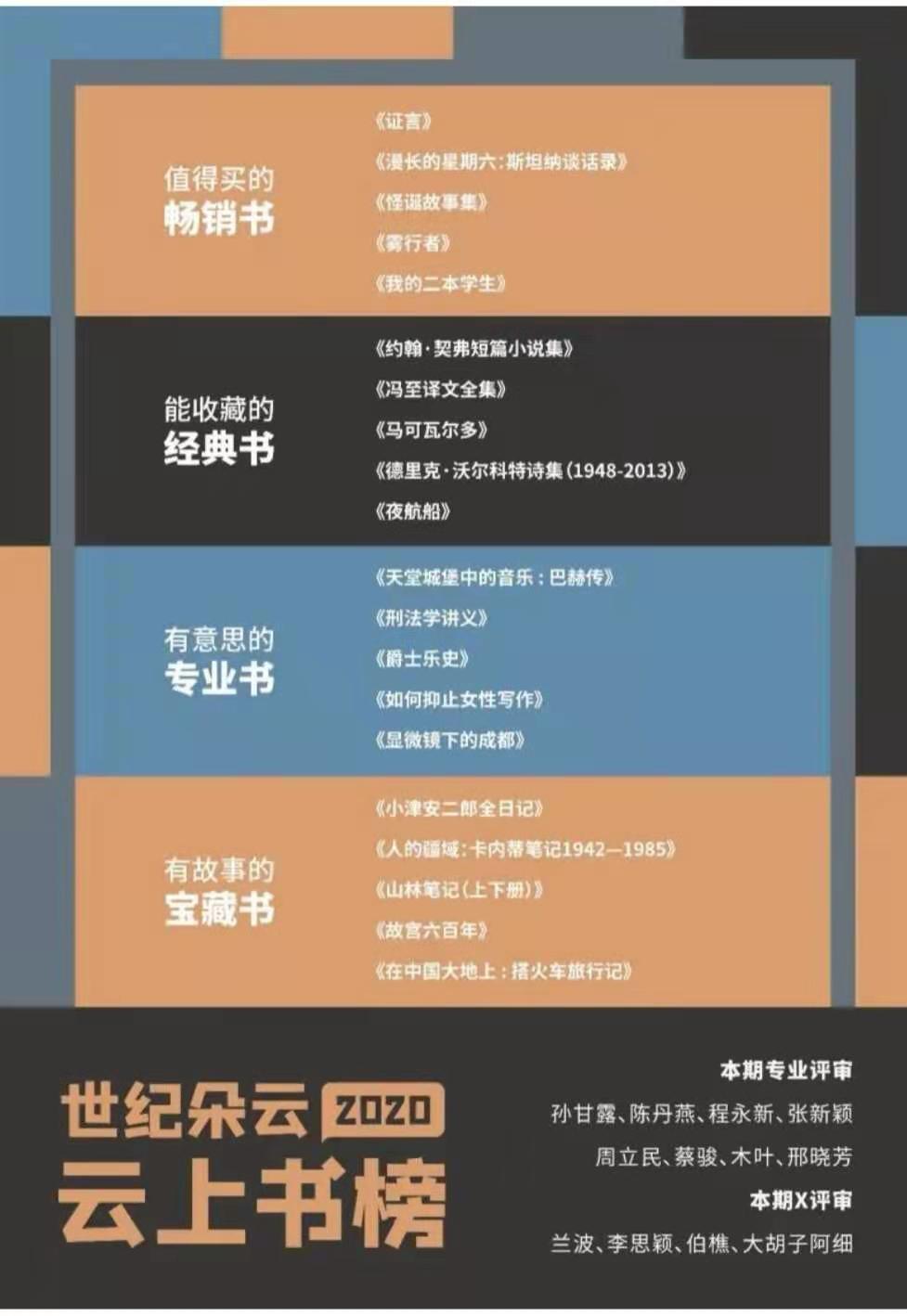 從2020年9月起, “云上書榜”至今已經評選出六期榜單。年榜評選范圍是2020年出版的圖書,候選書單由前六期的上榜圖書和評審們的補充書單組成。最終評選出4大類別共20本上榜圖書。其中,“值得買的暢銷書”是《證言》《漫長的星期六:斯坦納談話錄》《怪誕故事集》《霧行者》《我的二本學生》;“能收藏的經典書”是《約翰·契弗短篇小說集》《馮至譯文全集》《馬可瓦爾多》《德里克·沃爾科特詩集(1948-2013)》《夜航船》;“有意思的專業書”是《天堂城堡中的音樂 : 巴赫傳》《刑法學講義》《爵士樂史》《如何抑止女性寫作》《顯微鏡下的成都》;“有故事的寶藏書”是《小津安二郎全日記》《人的疆域:卡內蒂筆記1942—1985》《山林筆記(上下冊)》《故宮六百年》《在中國大地上 : 搭火車旅行記》。