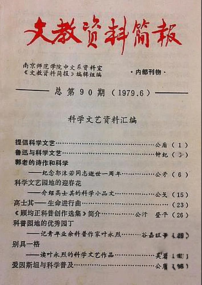 鄭公盾人特別胖。我一定是在哈爾濱會議上跟他開始的交往,我只記得他當時就說,我們住得很近,“你找一天到我家,我那里有一本書里面收錄了我的文章,也收錄了你的文章,我正好有兩本”。我那個時候家住在北京市東城區燈市口同福夾道四號空政文工團的院子里,而他住在史家胡同,跟我只有一個丁字路口的距離。我如期赴約到他家,他從書架上取到一本由南京師范學院中文系資料室編輯的《科學文藝資料匯編》。這其中,他的文章《提倡科學文藝》是全集的首篇。此外還有《愛因斯坦與科學普及》《為凡爾納的科學幻想小說恢復名譽》《法拉第和他的科普名作〈蠟燭的故事〉》,署名公盾。更有署名公矛的《郭老的詩作和科學——紀念郭沫若同志逝世一周年》、公戈的《科學文藝園地的迎春花——介紹高士其的科學小品文》,以及署名公汗的兩篇作品。我覺得所有這些其實都是他寫的。在那個年代里,由于作者極端短缺,許多報刊就會集中瞄準一個作者寫許多文章。但在發表的時候,由于處于同一個版面或一期雜志,一個人的名字不能出現多次,因此換名字是常事。葉永烈老師常常就在《文匯報》科技版上占據整個版面,但除了一個文章署名葉永烈之外,其他的文章都會用阿烈、阿艇、葉舟、葉丹作為作者名。后面兩個名字其實是他兒子的名字。當然,他兒子上中學后,也開始了科普創作,還出版過專門的書。這些都是后話。鄭公盾給我的選集中,有我《別具一格——讀葉永烈的科學文藝作品》一文。