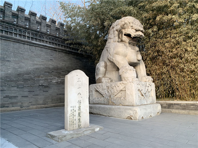 此地建筑由留英建筑師沈琪設計,稱得上美輪美奐。一百多年過去,桁梁依舊堅實,雕花依舊精美,冬日陽光照耀其上,兀然有穿越之感。它們和門前的石獅一起,見證了一段“城頭變幻大王旗”的歷史:1911年清帝遜位,帝制完結;1912年這里變成了袁世凱的總統府;1924年又變成了段祺瑞執政府所在地,1926年段祺瑞當政期間制造的“三·一八”血腥慘案,就發生在這對石獅子的前方。如今大門東側石獅旁邊,立著一尊樸素的漢白玉石碑,上書“‘三·一八’慘案發生地”八個大字。