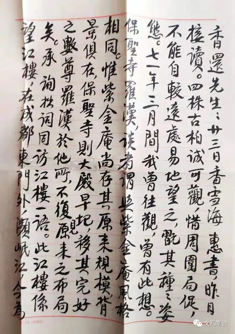 香還先生:廿三日香雪?;輹?,昨日接讀。四株古柏可觀,惜周圍局促,不能自較遠處易地望之,玩其種種姿態。七一年三月間我曾往觀,曾有此想。保圣寺羅漢,讀者謂與紫金庵風格相同。唯紫金庵尚存其原來規模,背景俱在,保圣寺則大殿早圮,移其完好之數尊羅漢于他所,不復見原來之布局矣。承詢拙詞同訪江樓一語。此江樓系望江樓,在成都東門外,瀕岷江,今為公園。當年朱先生寓居望江樓對面,地名宋公橋,我往訪,輒過橋同登望江樓吃菜,自于成都分別之后,未嘗再謀面,其時為一九四五年八月將盡。懷想彼時談敘之樂,能不感慨乎。尊大人年近八十,想必康健。其居何街何弄,侍奉者何人,均愿知之。語我作適當鍛煉,甚感,唯養成習慣為難,而又無人為之督責。平時只在室內或庭中來回踱步,得伴則近處走走耳。匆復不一,即請