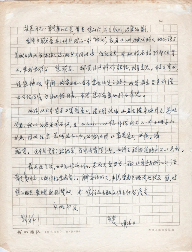 五通信札均為鋼筆書寫,文字內容著錄于2019年齊魯書社出版的《榆下夕拾》中,但個別字句有釋讀錯誤。第一通信札書寫在20×25=500的十六開稿箋紙上,橫寫,稿紙下側印有“我的稿紙(橫直兩用),香港上海書局監制”字樣。信札書文曰: