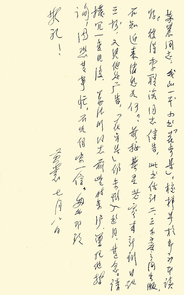 最近還是忙,也不知忙些什么,過兩天想寫一篇《魯迅與浙江》,給曾定夷同志,上海作協要開會了。月前姜德明兄來滬,曾數次晤談,也談及您,對您的眼光、氣魄都極贊嘆。盼你們的出版社做出好成績來。匆此即致敬禮!