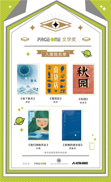 今年,一個致力于挖掘優秀原創作品,鼓勵年輕創作者和文學新人的全新文學獎——PAGEONE文學獎由PAGEONE書店、清華大學文學創作與研究中心與國際出版品牌Astra House共同發起。3月17日,首屆PAGEONE文學獎公布入圍短名單,榜上有名的作品有:梁空的《地下春天》、張忌的《南貨店》、楊本芬的《秋園》、孫頻的《我們騎鯨而去》以及陳春成的《夜晚的潛水艇》。