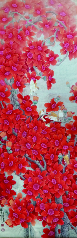 這幅《花開有聲》的獨特之處還在于畫家表現的角度,不是慣常的仰視或平視的角度,而是采取一種聚焦,以及層層推進的手法,刪去無關緊要者,集中地聚焦于對花的描寫,如此集中而強烈鋪排的藝術手法,卻是過去畫木棉者所少見的,這也體現了陳奕純勇于突破傳統的膽量。從人們所意想不到之處落筆,便成就了一種新鮮的藝術的感動。