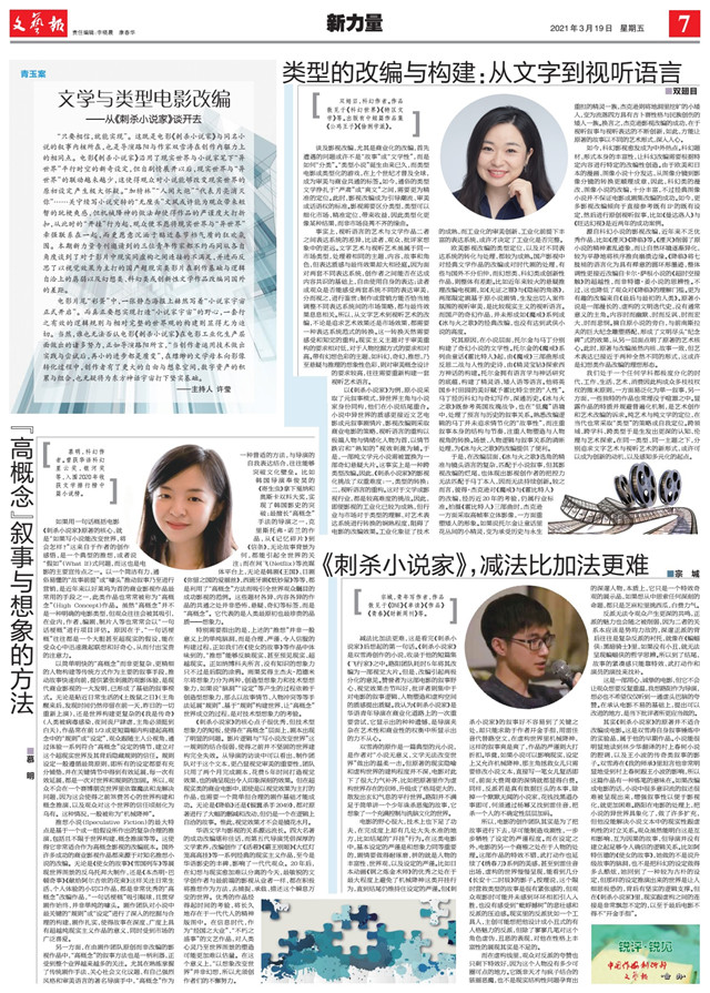 “只要相信,就能實現”。這既是電影《刺殺小說家》與同名小說的敘事內核所在,也是導演路陽與作家雙雪濤在創作內驅力上的相同點。電影《刺殺小說家》沿用了現實世界與小說家筆下“異世界”平行時空的新奇設定,但自劇情展開以后,現實世界與“異世界”的聯動越來越少,這使得觀眾對小說能夠改變現實世界的原初設定產生極大懷疑?!凹犹亓帧薄叭碎g大炮”“代表月亮消滅你”……關寧續寫小說突轉的“無厘頭”文風或許能為觀眾帶來短暫的玩梗爽感,但機械降神的做法卻使得作品的嚴謹度大打折扣,從此時的“開掛”行為起,觀眾便不愿將現實世界與“異世界”牽強聯系在一起,而更愿意沉湎于貼近春節檔氣質的狂歡氛圍。本期新力量??埖降娜磺嗄曜骷叶疾患s而同從各自角度談到了對于影片中現實同虛構之間連接的不滿足,并進而反思了以視覺效果為主打的國產超現實類影片在劇作基礎與邏輯自洽上的孱弱以及幻想類、科幻類或創新性文學作品改編同國外的差距。
