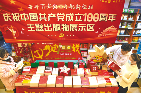 安徽省阜陽市新華書店“奮斗百年路 啟航新征程”慶祝中國共產黨成立100周年主題出版物展示區,讀者在選購黨史黨建書籍。王彪 攝
